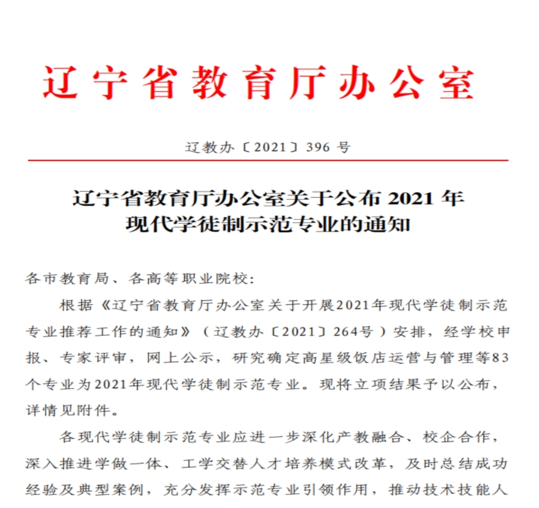2021年11月11日根据《辽宁省教育厅办公室关于开展2021年现代学徒制示范专业推荐工作通知》(辽教办[2021]264号)安排,经学校申报、专家评审,网上公示,研究确定83个专业为2021年现代学...