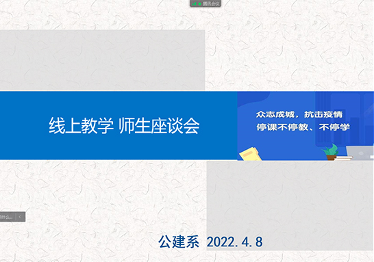 云端相守 师生座谈 --公建系线上教学座谈会为深入了解我系学生疫情期间的思想动态和学习、生活的实际困难,4月8日下午,组织召开线上教学师生座谈会。王浩主任、李苗苗副主任及全体教研室主任和各班学委代表3...
