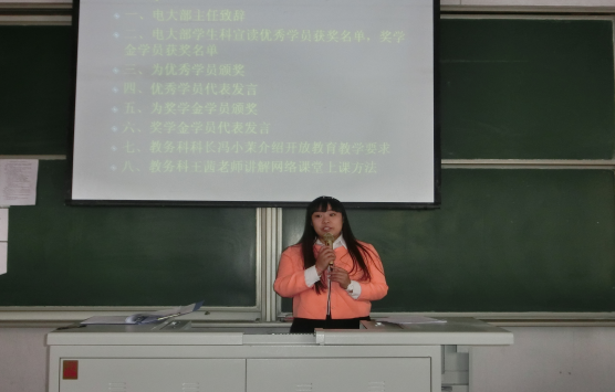 典礼上表彰了于博等十二名优秀学员和孙红岑等六名奖学金学员。教务科科长冯小茉对新学员的学习及考试情况作了详细的说明。教务科王茜老师对如何在国开新平台上学习做了指导。