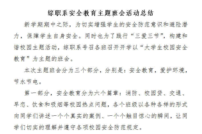综职系安全教育、节水节电、爱护环境班会总结