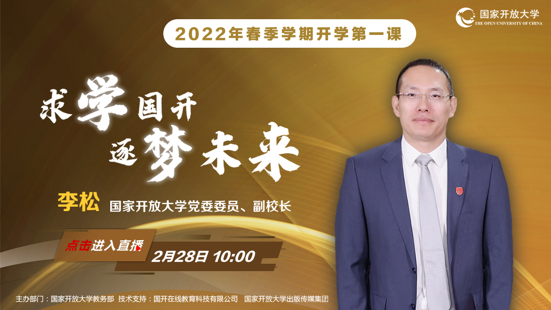 2月28日上午10:00,国家开放大学党委委员、副校长李松将以视频直播的方式进行2022年春季学期“开学第一课:求学国开,逐梦未来”直播,请大家准时收看。