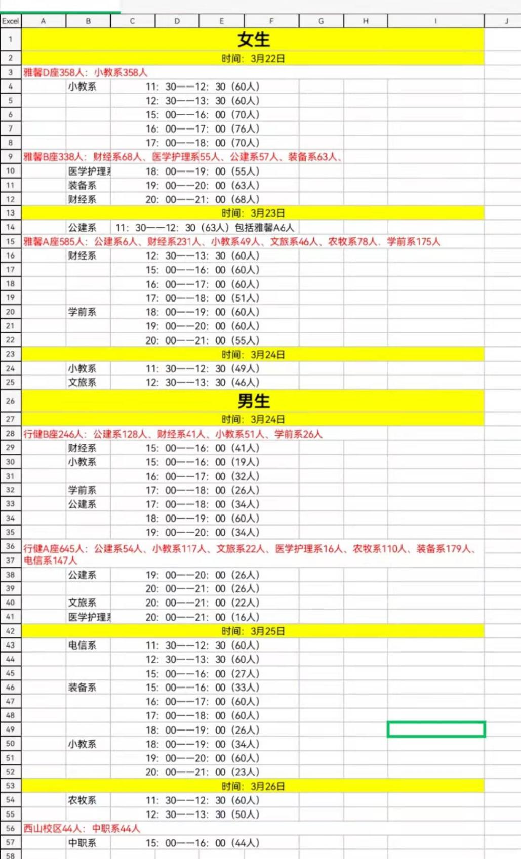 想学生之所想,解学生燃眉之急。为解决学生洗浴问题,根据各系实际情况学生处学工人员制定了按系分时段的最优洗浴方案,即便于管理又避免大量学生聚集,保障学生校园内基本生活需求。