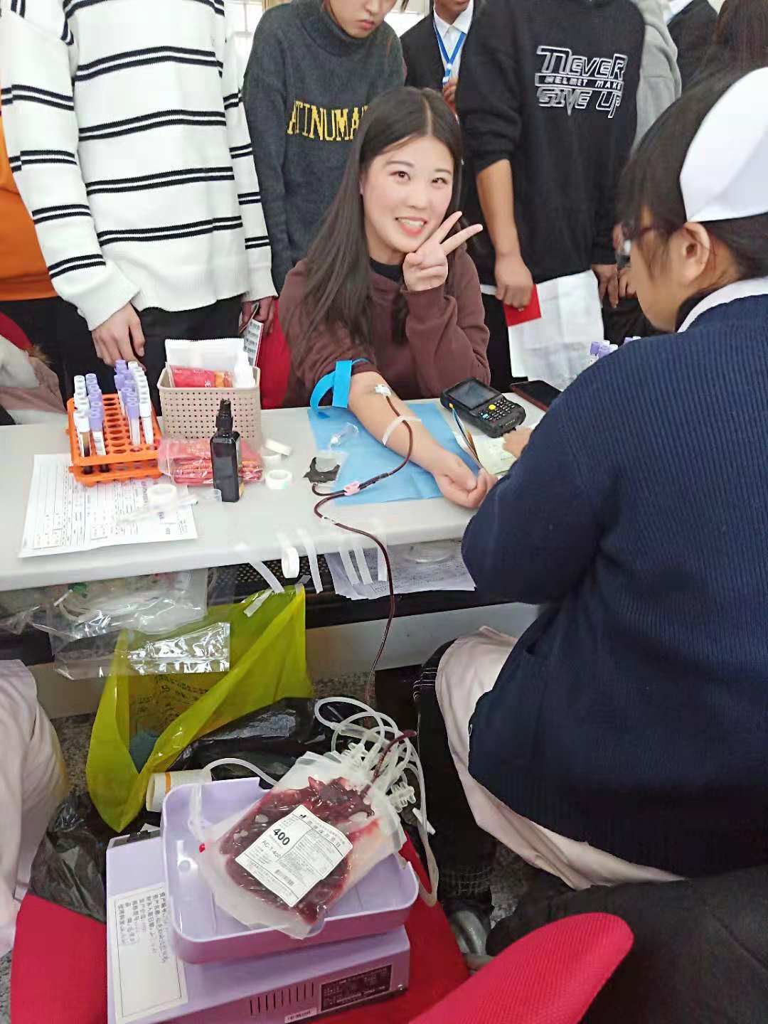 据悉,本次活动全校有近300名无偿献血者,这个数字在接下来的两天中还将会继续攀升。夜幕降临,寒风习习。可同学们的献血热情不减,报名处仍有不少正在认真填写健康征询表。“您的献血是托起他人生命的希望,生命因您而延续。” 这份澎湃的爱心热潮将在高专每一个人心中传递。