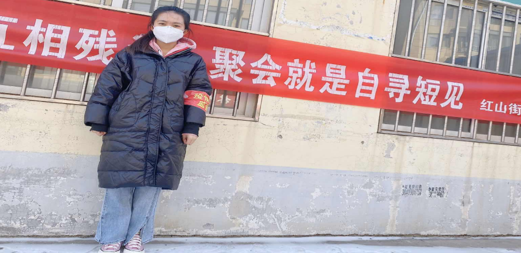 刘蕊,公建系17造价班学生。红山街道一名抗疫志愿工作者,主要负责对进出小区的居民测量体温并核对出入证明、对外来车辆进行登记等工作。
