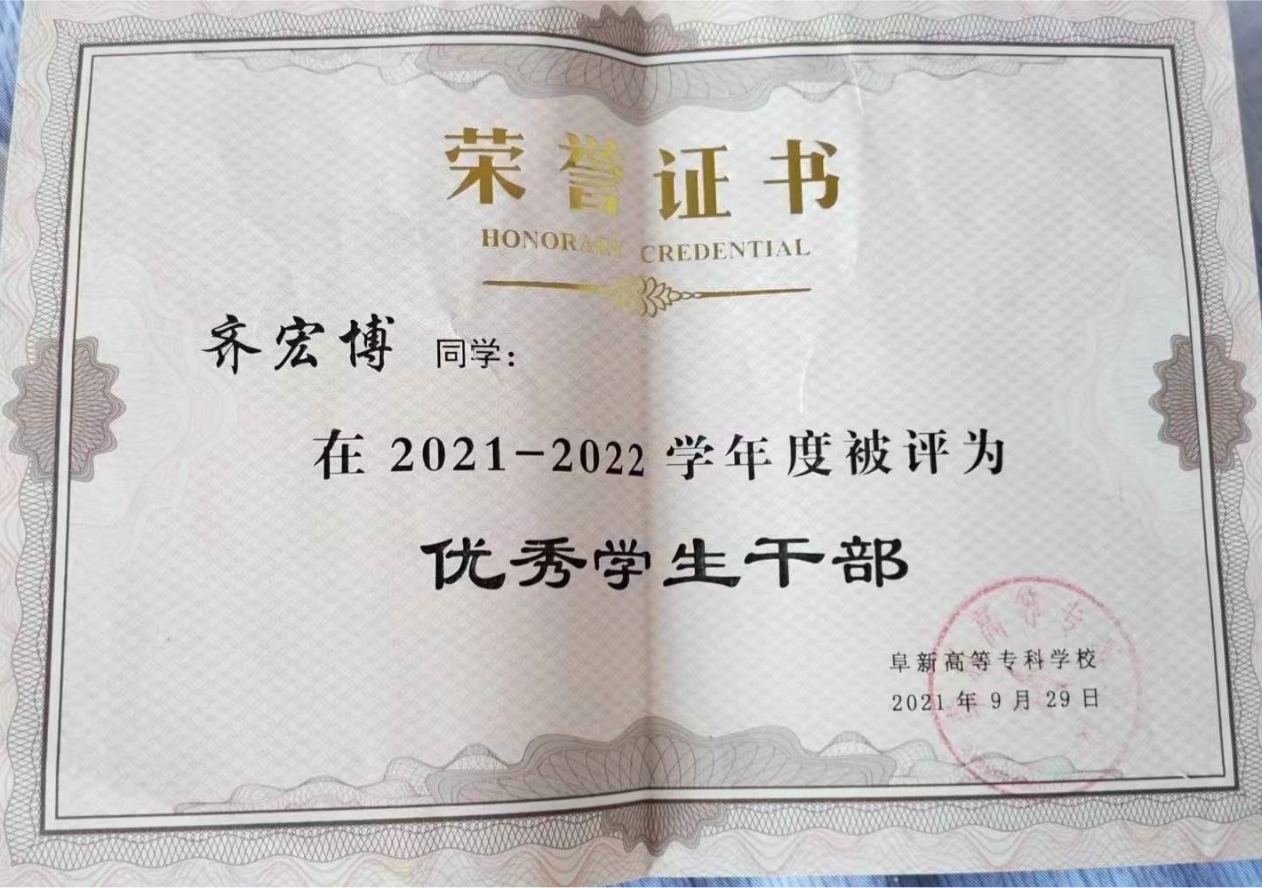 工作方面,该生曾先后担任班级班长,文化旅游系学生会主席。因表现突出,获得“优秀共青团员”、“优秀学生干部”、“三好学生”等光荣称号。积极参加学校和系里组织的各项活动,在辽宁省第十八届职业院校技能大赛创新创业比赛(高职组)《体育+》赛项中,作为主力队员参加比赛,荣获省教育厅颁发的“三等奖“,为学校争得了荣誉,同时因为齐宏博同学在校学习期间的优异表现,被评为辽宁省2023届普通高等学校“优秀毕业生“的光荣称号。