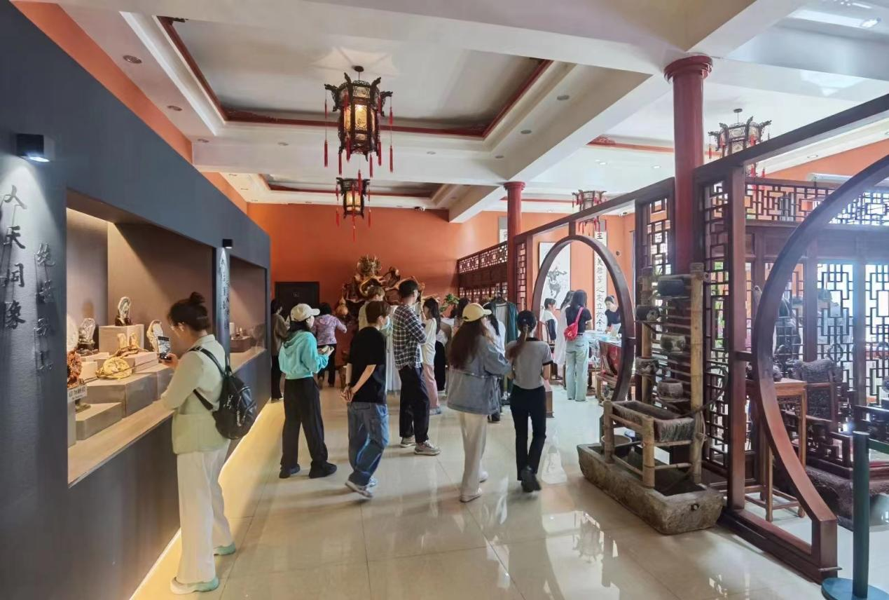 第二站是阜新玛瑙文化博物馆(玉龙弘艺)。阜新玛瑙文化博物馆前身为深圳市玉龙珠宝有限责任公司,由国家工艺美术大师、享受国务院政府特殊津贴专家、中国玉文化研究会副会长、中国玉雕艺术委员会副会长、中国玉雕俏形艺术创始人曹志涛先生创办,始建于1990年,2023年3月开始对外开放,是阜新市社会科学普及基地。博物馆以非物质文化遗产传承为脉络,收藏和展示阜新玛瑙雕刻作品百余件。博物馆分为原材料展示区、工艺成品展示区、制作工具展示区、文化体验区、手工体验区域、商品陈列区等,还通过举办艺术讲座、学习交流活动,让参观者获得立体视觉体验。参观过程中,博物馆负责人曹辉老师详细为同学们介绍玛瑙基础知识、玛瑙作品的设计雕工和文化,其他工作人员带领同学们到文化、手工体验区和商品陈列区进行体验。