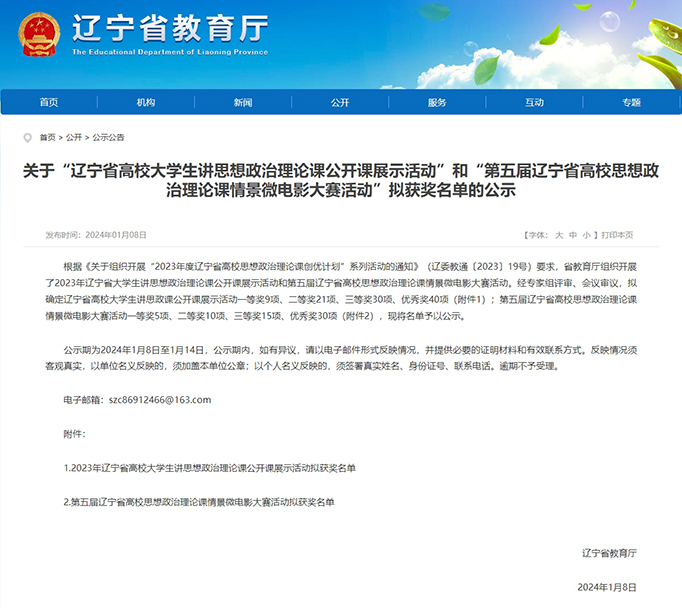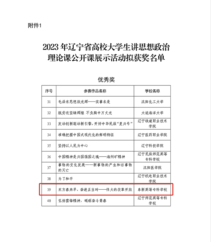 日前,辽宁省教育厅公布了关于“辽宁省高校大学生讲思想政治理论课公开课展示活动”和“第五届辽宁省高校思想政治理论课情景微电影大赛活动”拟获奖名单的公示。由beat365思想政治教学部岳凤娇老师专业指导,我系学生马骏驰主讲的《东方春来早,奋进正当时——伟大的改革开放》荣获优秀奖。