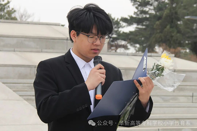 学生干部王广研在发言中向同学们发出号召:作为新时代的青年,我们要珍惜今天来之不易的和平,在中国共产党的领导下、在社会主义建设事业的历史进程中,我们要弘扬爱国奉献精神,担负当代青年历史使命,立志为党、为国、为人民奉献一切,奋斗终身,为实现中华民族伟大复兴的中国梦贡献青春力量。