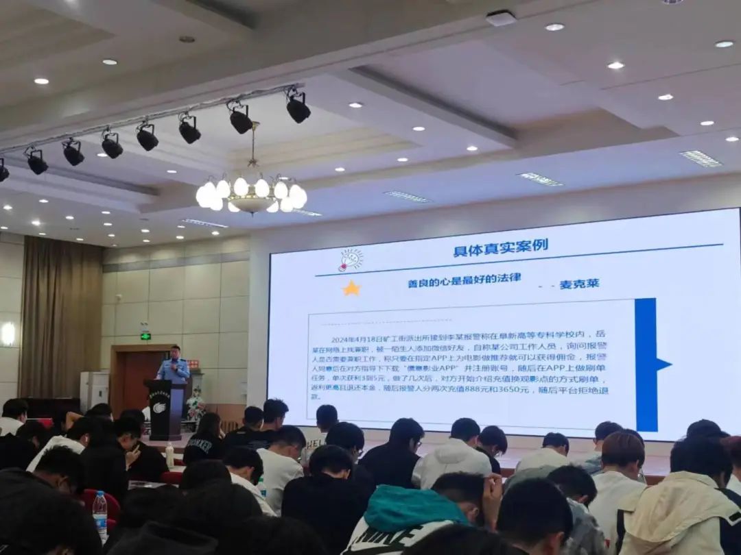 讲座特聘请矿工街派出所驻校民警主讲。讲座上,民警“以案说法”,从法的本质、大学生最常遇见的违法犯罪种类、违法犯罪后果等方面展开,通过具体实例,介绍了“网络诈骗”“打架斗殴”“校园霸凌”“盗窃”等违法犯罪行为,并提出防范建议。除此之外,主讲民警还针对当今互联网技术的发展和犯罪方式的改变,介绍了“刷单”“裸聊”“网贷”等新型网络诈骗,告知学生远离网络诈骗,遵纪守法、避免陷入不法分子的“圈套”和违法犯罪的“漩涡”。