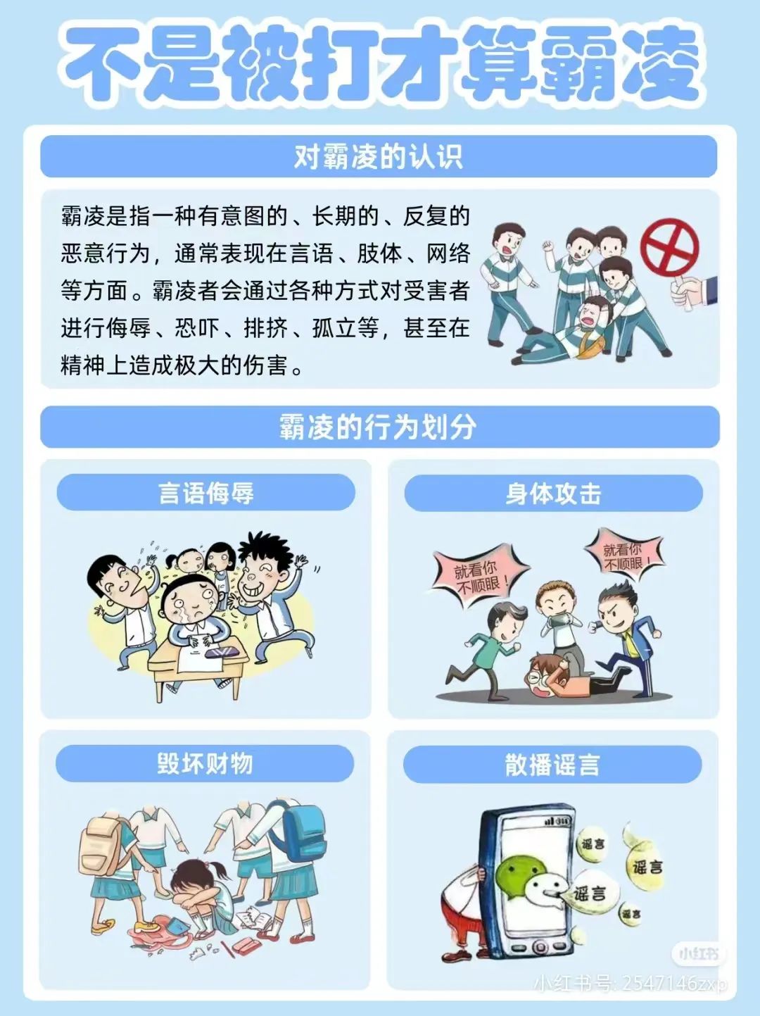 校园霸凌是指在学校范围内,以一种恶意、攻击性的方式对他人进行精神或身体上的伤害。它包括言语霸凌、行为霸凌、网络霸凌等多种形式。校园霸凌不仅普遍存在,而且具有严重性。它让受害者承受着巨大的心理压力,影响其学业、人际关系和心理健康。校园霸凌对受害者的影响是深远的。首先,受害者的心理健康受到严重影响,可能导致自卑、抑郁等心理疾病。其次,校园霸凌使受害者学业成绩下滑,影响其未来发展。此外,受害者在人际关系中也容易受到排斥,使其社交能力下降。