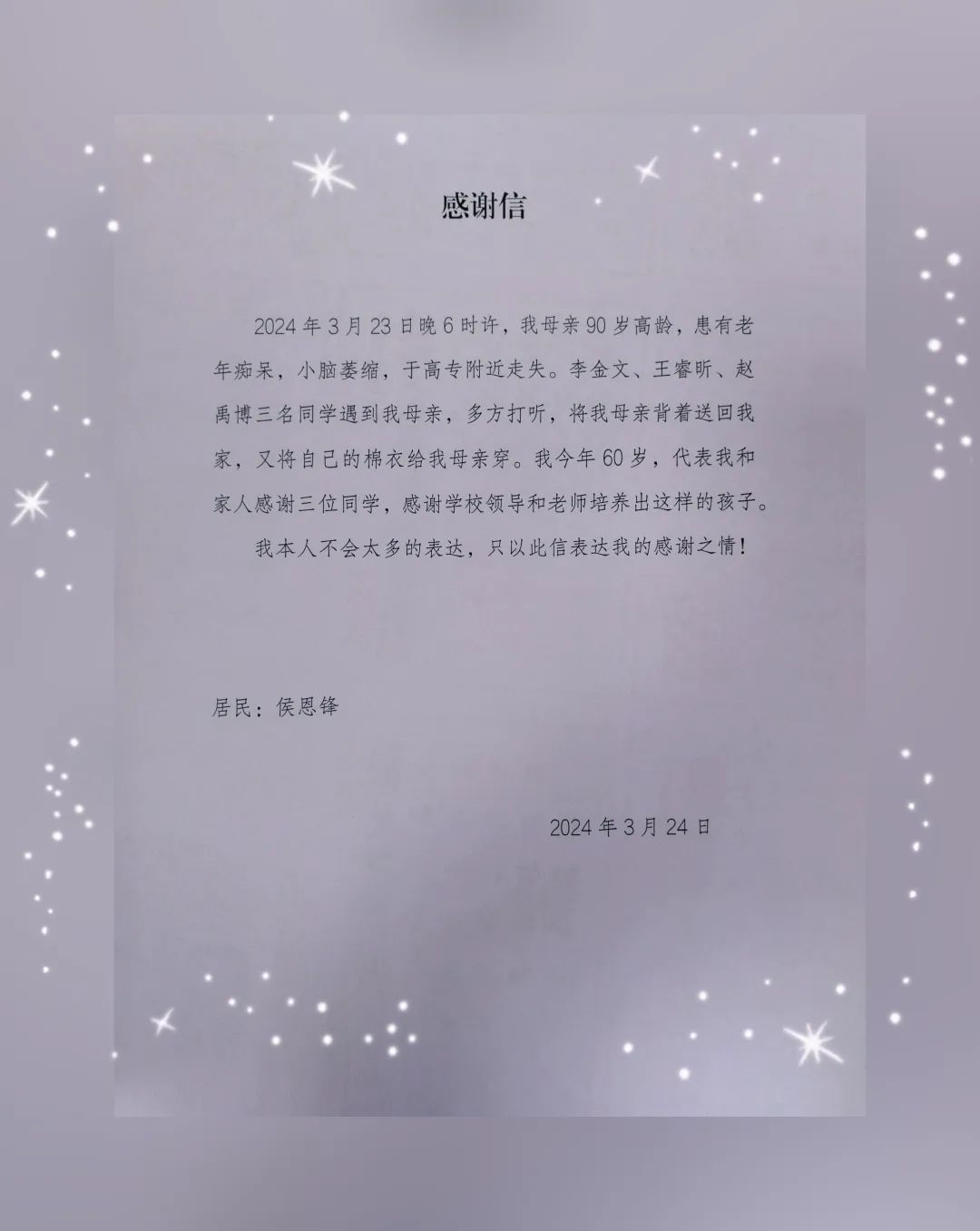 总有一些人,他们默默无闻,却用实际行动传递着温暖和力量,诠释着“雷锋精神”的深刻内涵。近日,市民侯先生将一封诚挚的感谢信送到了beat365英国官网网站,表示要感谢帮助了他母亲的李金文、王睿昕、赵禹博三名同学。同时,也感谢beat365的培养,祝愿学校今后培养出更多用自己的行动传递着温暖和力量的好学生。