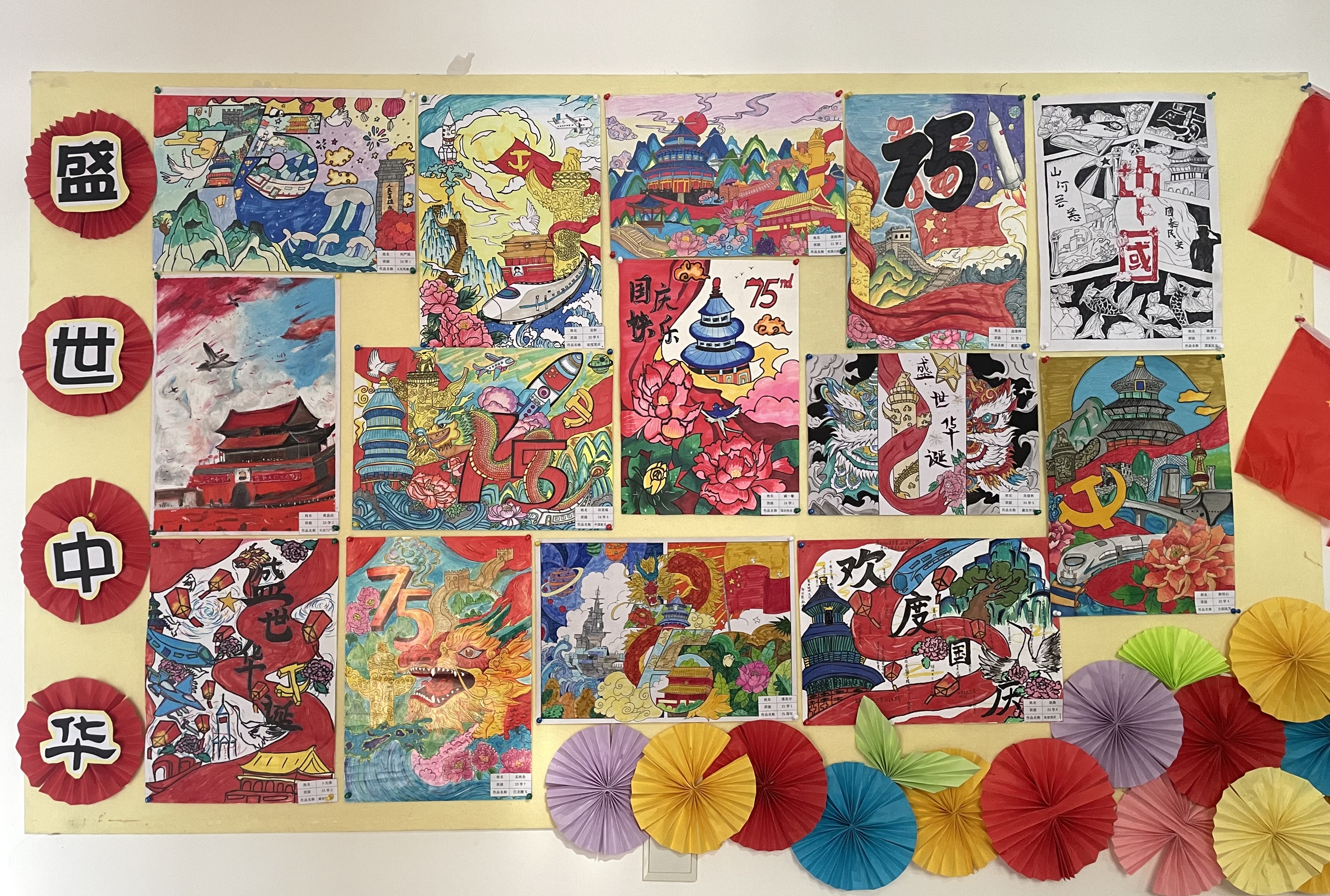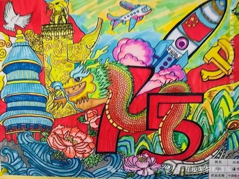 10月7日,学子们纷纷向老师投稿。瞧,红色象征革命,黄色象征光明。白鸽象征寓意着祖国和平,绚丽色彩交织成祖国的壮丽画卷。五星红旗飘扬,天安门庄严肃穆,每一笔都诉说着新中国 75 年的辉煌历程,处处都洋溢着学子们对祖国的热爱与自豪。这些爱国画卷不仅是艺术的展示,更是学子们爱国情怀的表达。