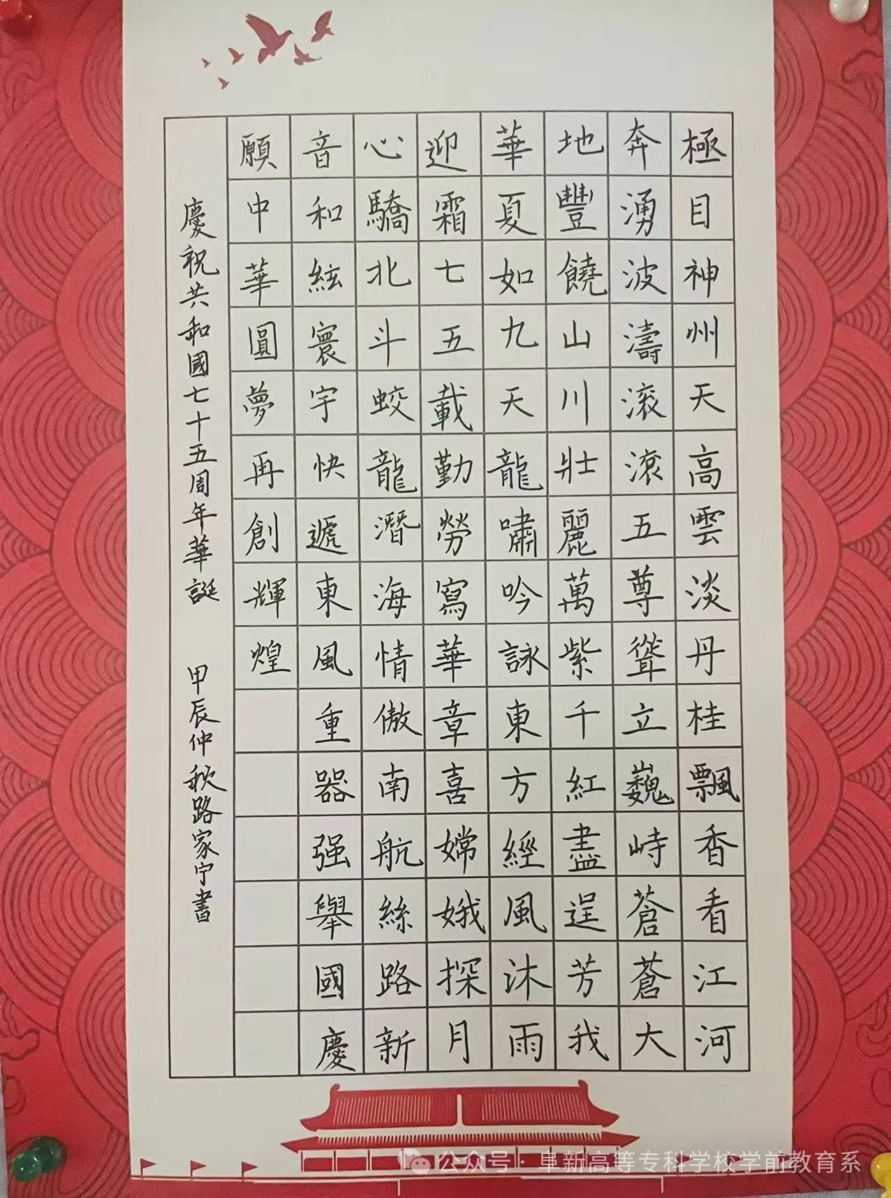 七十五载沧桑铸就时代华章,五千年翰墨礼赞盛世中华。为庆祝中华人民共和国成立75周年,弘扬爱国主义精神,传承中华优秀传统文化,激发学子爱国热情,凝聚强国奋进力量,学前教育系学子们,以青春之名,用行动献礼盛世中华。