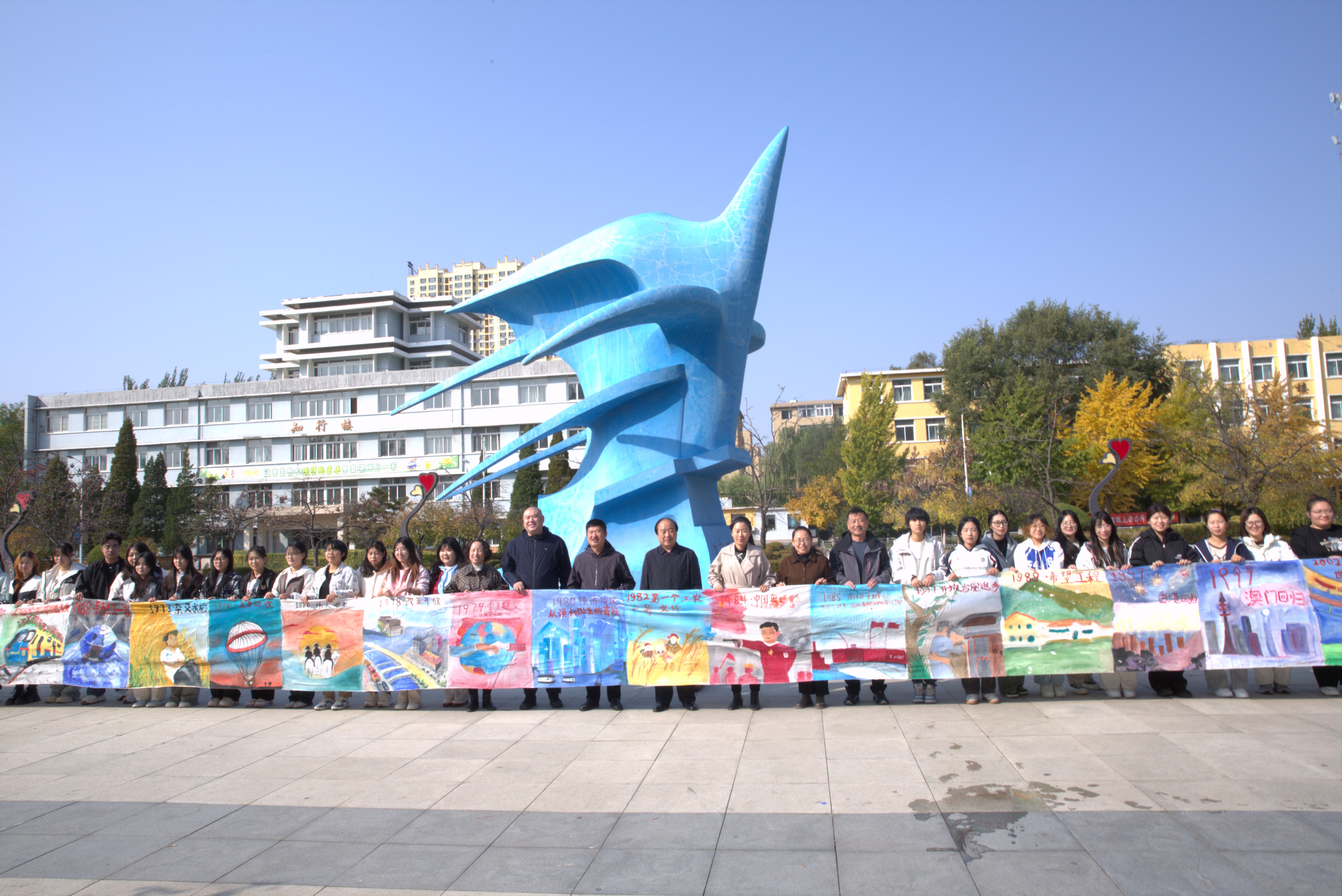 10月16日中午电信系在校休闲广场完成了中华人民共和国成立75周年的长卷绘制,校党委书记王海鑫,校长李妮,党委副书记刘振宇、副校长魏彤光莅临活动现场。