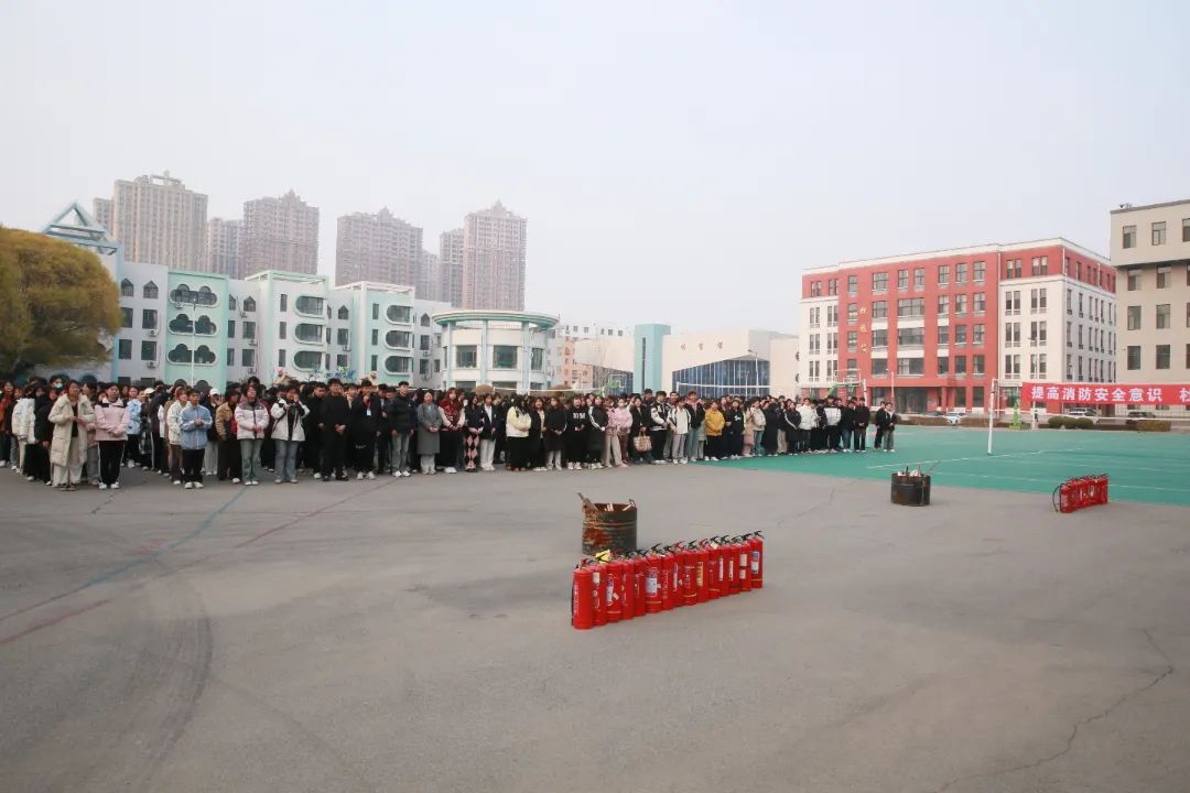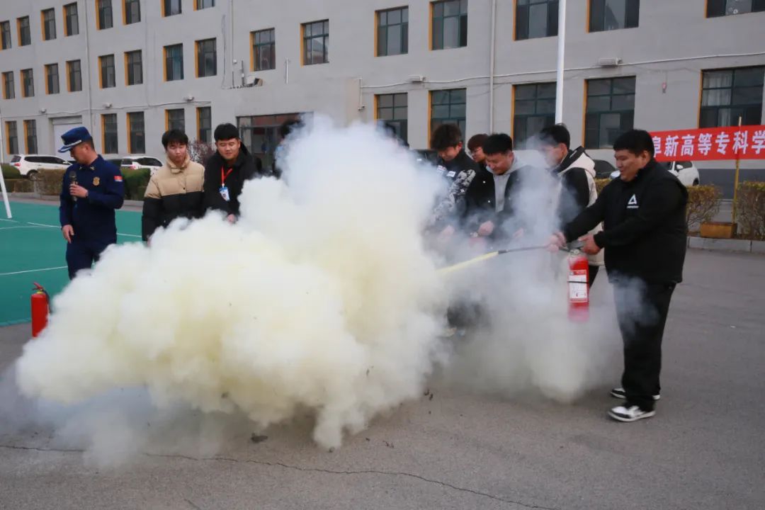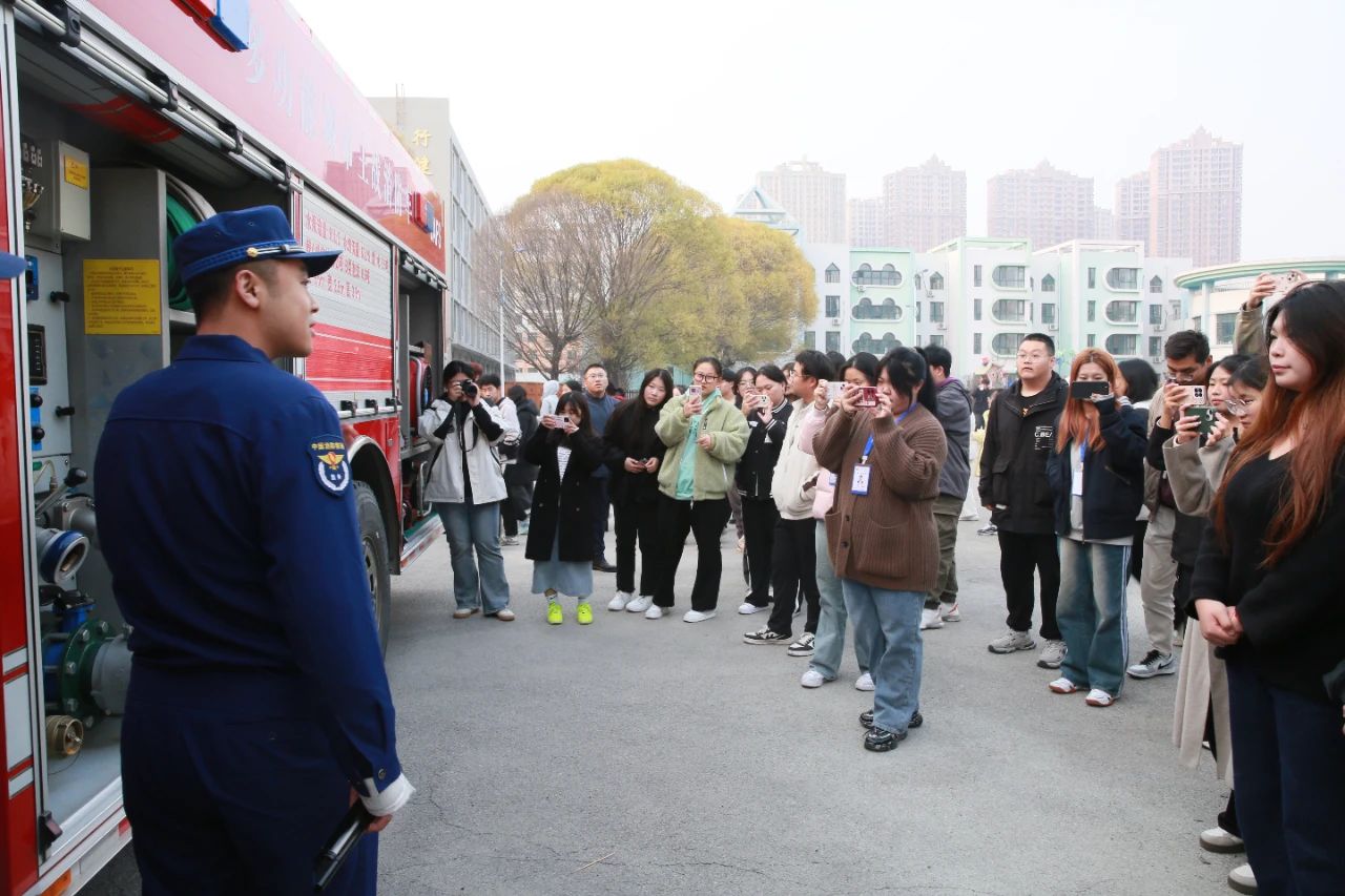 随后,消防救援大队指战员讲解了干粉灭火器的检测要点和使用方法,按照“一提、二拔、三握、四压”的使用步骤进行了演示,学生代表在指导下参与了对模拟火点的灭火操作。消防指战员们还向同学们介绍了多功能消防车实战灭火操作。