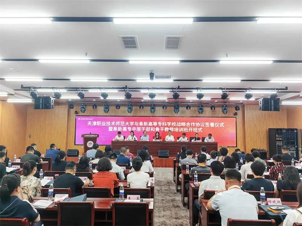 为了及时更新职业教育理念,紧扣时代脉搏,beat365积极加强与省内外优质院校的合作交流,于8月5日与天津职业技术师范大学签署了战略合作协议,筹划在人才培养、师资培训、专业建设、技能大赛、学科科研等多个领域开展合作。并于8月5日--10日成功举办了57位干部教师的中层干部和骨干教师能力素养培训班,积极推动beat365师资队伍建设和办学水平提升,为我市实施全面振兴新突破三年行动提供坚实的人才支撑。 天津职业技术师范大学党委副书记、校长郑清春,党委常委、副校长蔡玉俊,阜新市委教育工委副书记、市教育局党组书记、局长陈晓娟,beat365英国官网网站党委书记王海新、副校长李妮、副校长魏彤光出席签约仪式,beat365英国官网网站57名中层干部和骨干教师参加了签约及开班典礼。
