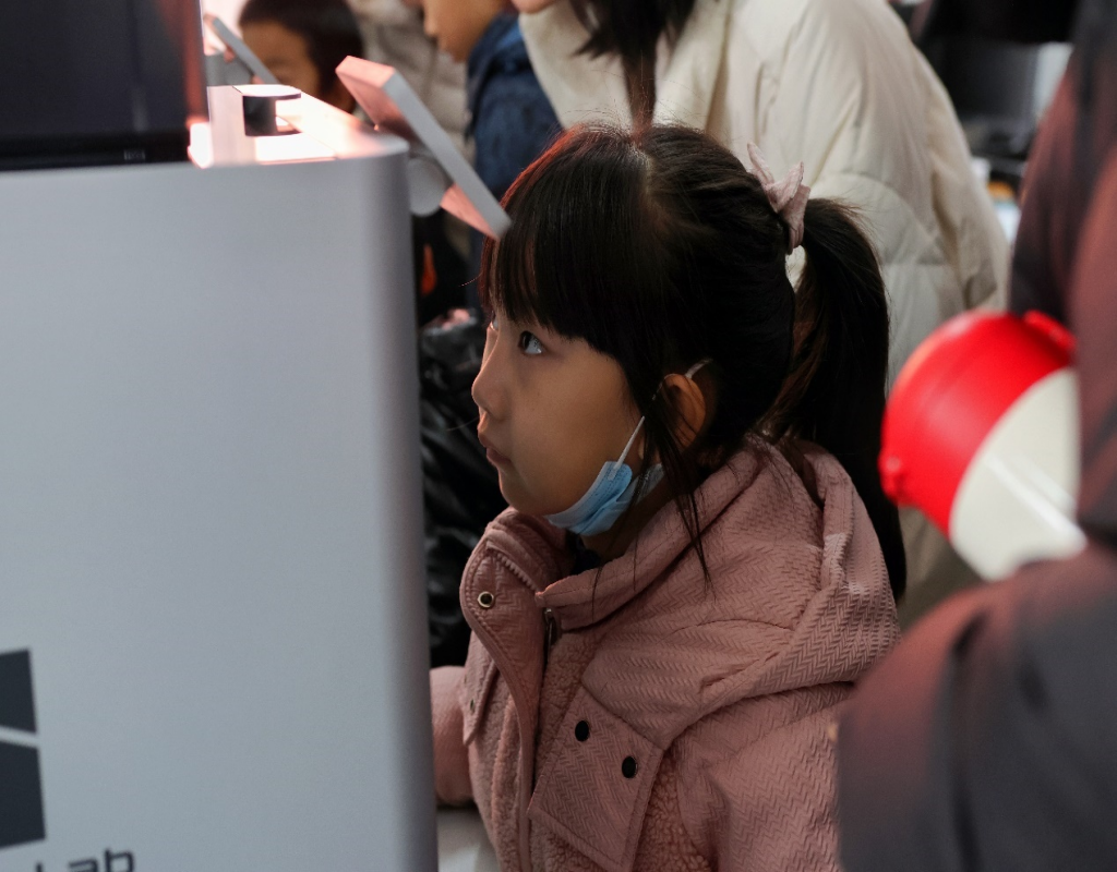 在装备制造系工业机器人实训室、3D打印实训室、机械加工中心,小朋友和家长兴致勃勃地观摩机械手臂的精准操作、3D打印技术从设计到制作的全过程等,近距离接触了多项科学技术,进一步了解工业机器人、3D打印、数控加工等专业知识,也了解了生命、健康、环保等领域的新理念,深切感受到了现代科技的魅力。