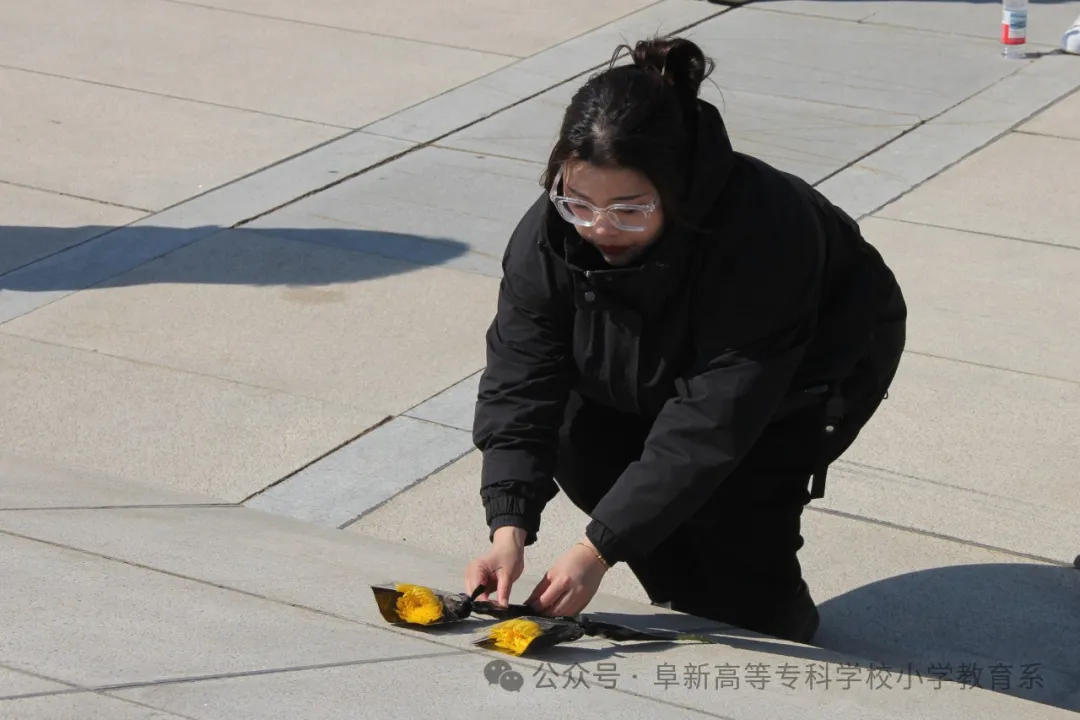 在阜新万人坑死难矿工纪念碑前,全体师生肃立默哀,敬献白菊。