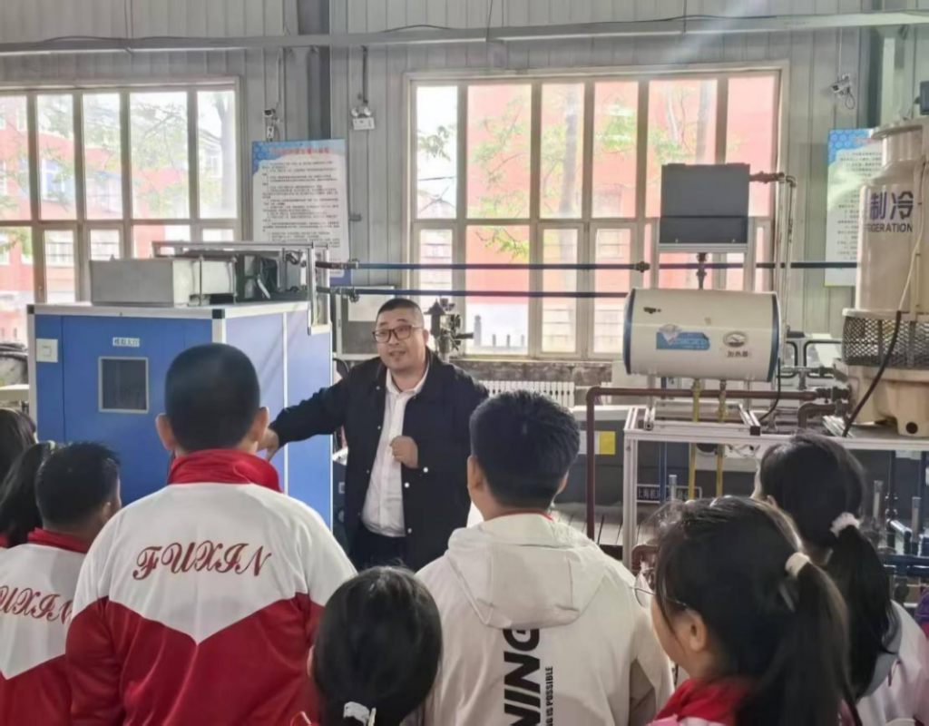 在大冷实训室,刘兆群老师用生动有趣的语言为同学们讲解了制冷设备的原理和操作流程。他一边讲解,一边与学生们互动问答。面对孩子们的奇思妙想,刘老师耐心解答,并邀孩子们共同体验冷库、空调的制冷制热过程。同学们兴致勃勃,纷纷举手参与体验,现场气氛热烈。实验小学带队教师评价:“这种互动式学习远超课堂理论,孩子们对技术工种有了全新认识。”