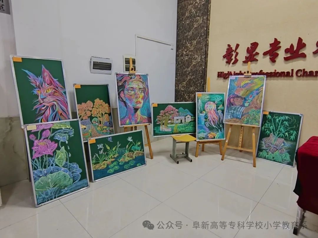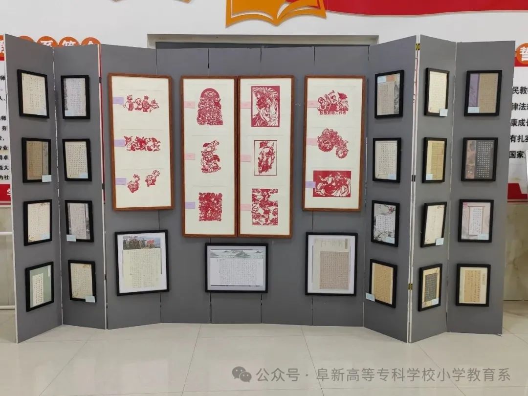 展区内容聚焦课堂实用技能,展览设置书法、剪纸、粉笔字(画)、互动区四大实践板块:书法展区楷书作品工整俊秀,行书作品笔锋遒劲,书写内容均取自小学语文教材篇目;剪纸展区作品栩栩如生,作品分为神话故事、传统纹饰、传统与创新、爱国四个主题;粉笔字(画)展区设计精巧,在一笔一划中展现出未来小学教师扎实的基本功;互动区专属定制手写书签,为参展观众送上美好的祝福。