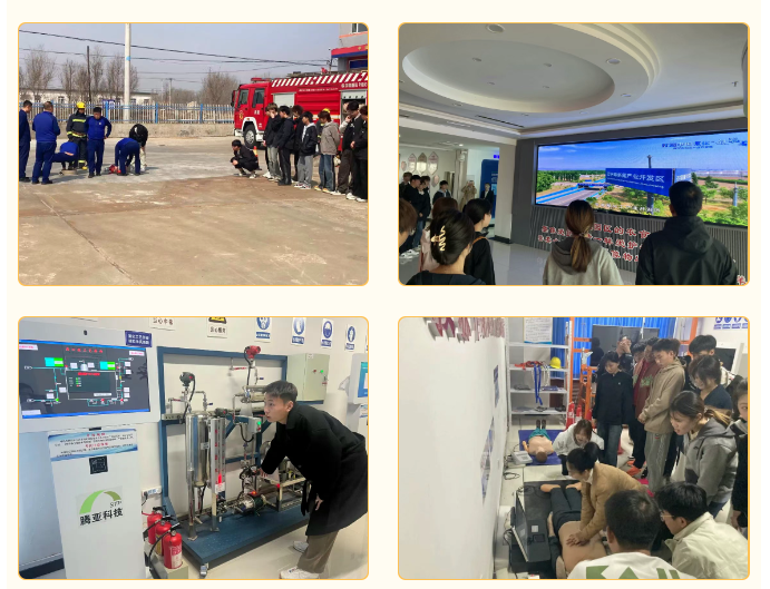 在本次园区教学期间,还组织参观了阜新市氟化工园区智慧管理平台,让专业学生直观的了解化工园区安全监控与风险预警系统;借助VR技术沉浸式体验高处坠落、危化品爆炸等事故场景,强化风险认知;在园区消防队指导下,了解灭火原理,以及不同类型火灾的灭火流程及灭火器选用技巧,并系统掌握心肺复苏、灭火器使用及正压式呼吸器操作等应急技能。同时,实践教学还针对氟化工工艺典型事故开展了应急预案推演与实操训练。