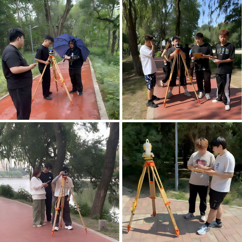 实训过程中,教师详细讲解测量任务要点、安全规范和相关实训要求,学生们以小组为单位,携带水准仪、全站仪等专业设备,穿梭于公园的坡地、广场与林间。学生们严格按照测量规范,反复校准仪器、记录数据、闭合差计算,力求毫米级精度;导线测量中,各小组协同配合,完成选点、测角、量边等一系列操作,将课堂所学的误差调整、平差计算等理论知识,精准应用于实际测量工作。
