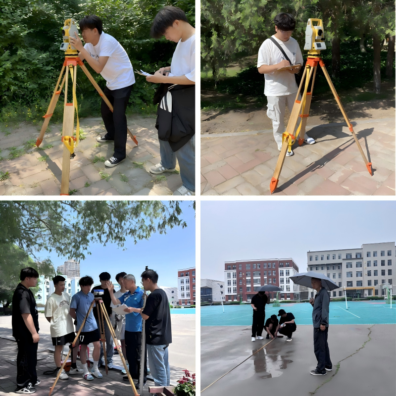 为了精准捕捉数据、优化作业流程,同学们主动放弃午休,在烈日下持续奋战。汗水浸湿了衣衫,阳光在仪器金属表面反射出耀眼的光,但瞄准镜后的目光始终专注如炬,对中、整平、读数,每一个动作都力求分毫不差。阵雨突袭,同学们迅速撑起雨伞,扶稳标尺、记录数据,风雨中的每一个坚持,都是对“精益求精”工匠精神的无声诠释。