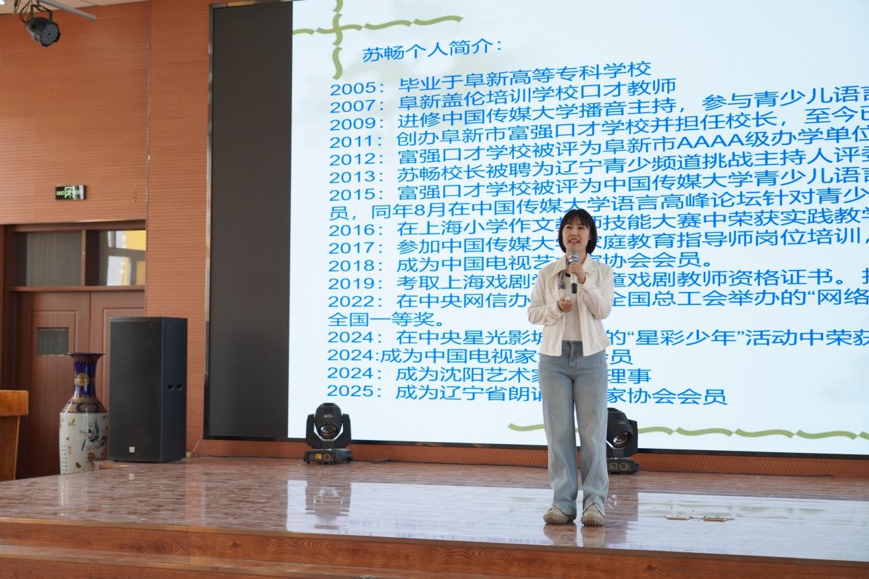 “用声音和情感塑造形象,绽放艺术语言的魅力” 朗诵艺术系列专题讲座,在beat365砺能楼报告厅顺利开展。本次讲座特别邀请到辽宁省朗诵艺术家协会会员、小学教育系合作单位阜新市富强口才学校苏畅校长担任主讲人,她以专业的视角与丰富的经验,为24级小学教育和小学语文教育两个讲座课堂,从诵读的基本要求、表演要求到戏剧效果要求,层层递进,干货满满。