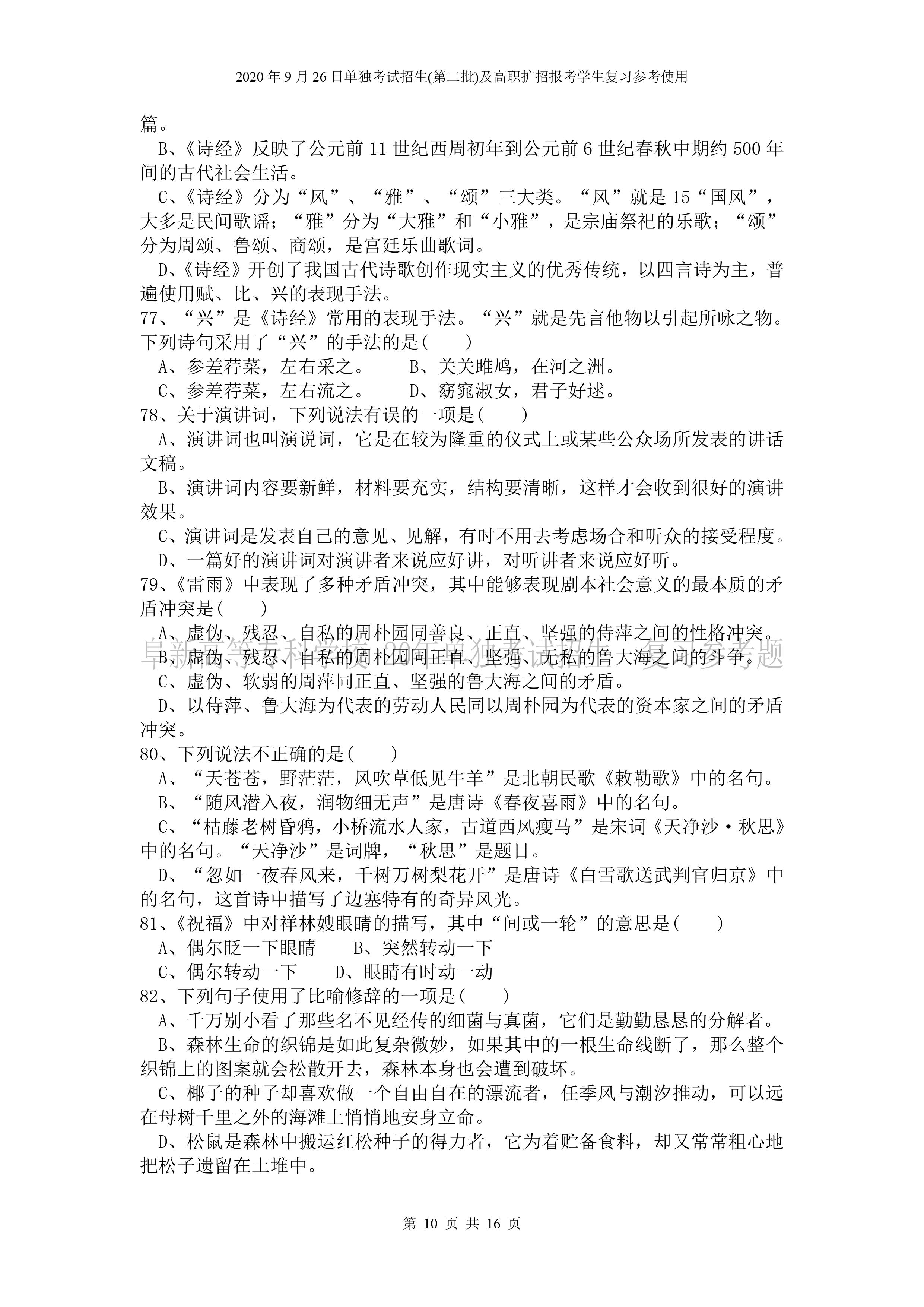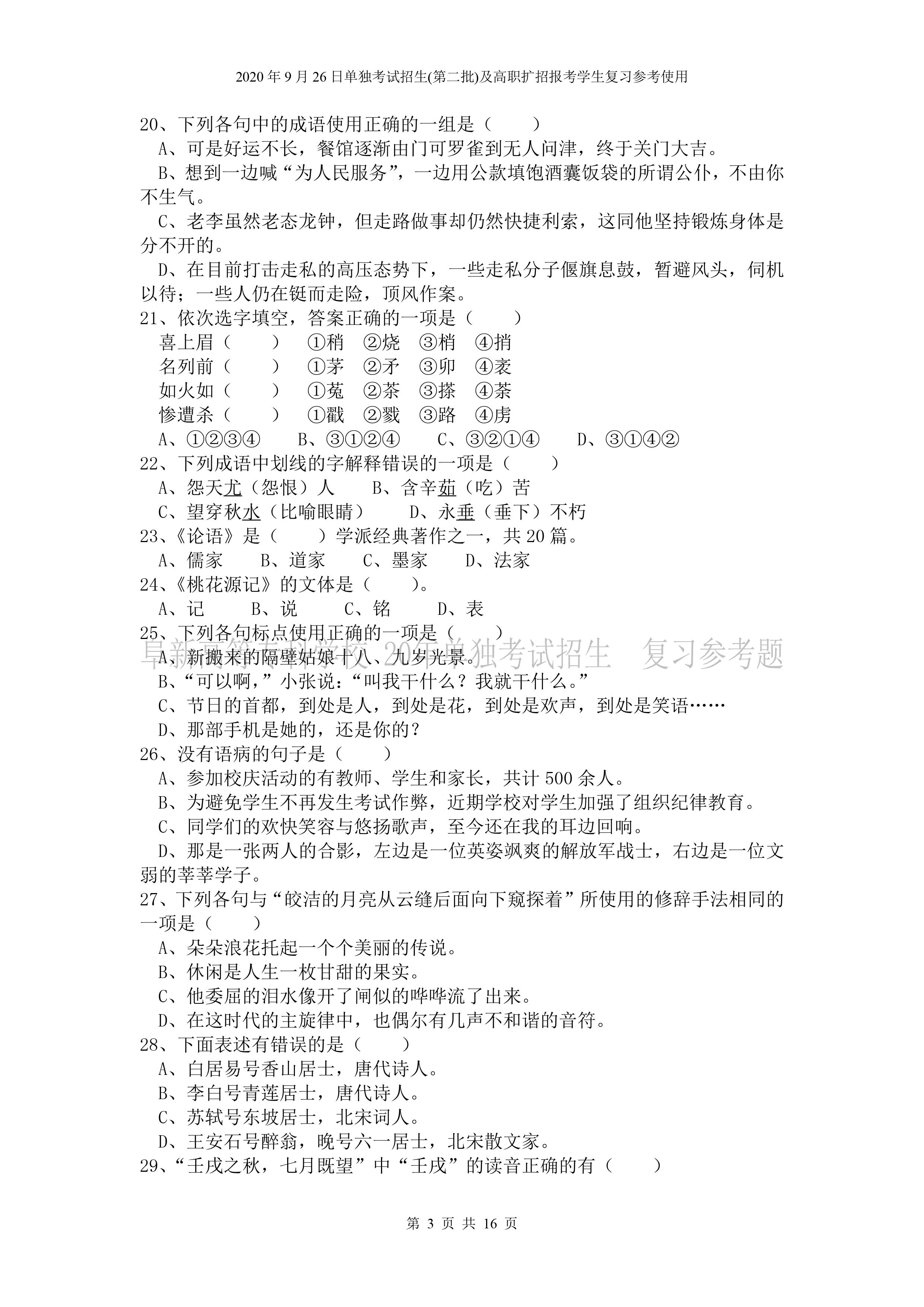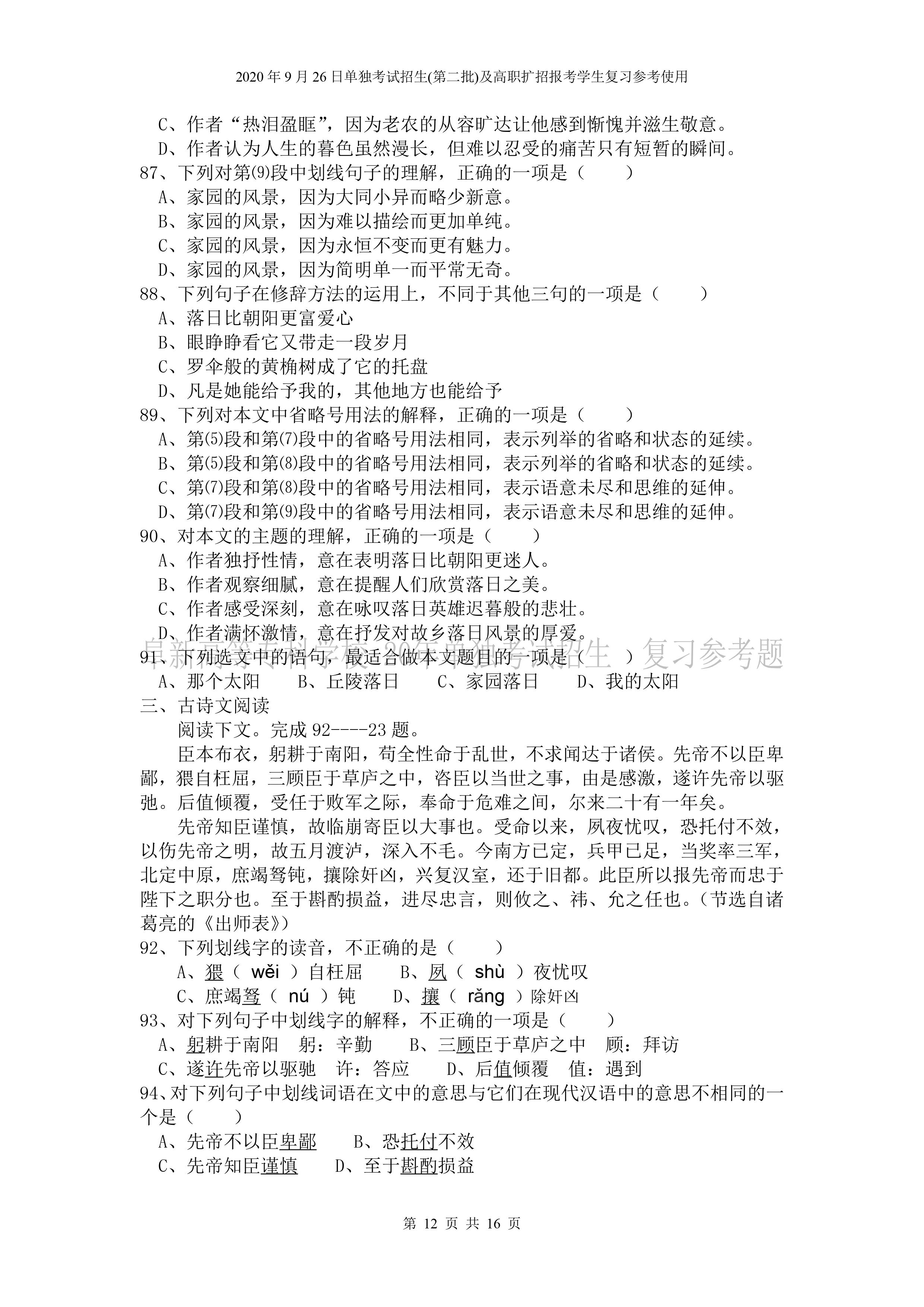 beat365英国官网网站2026年单独招生考试 《语文》复习参考试题