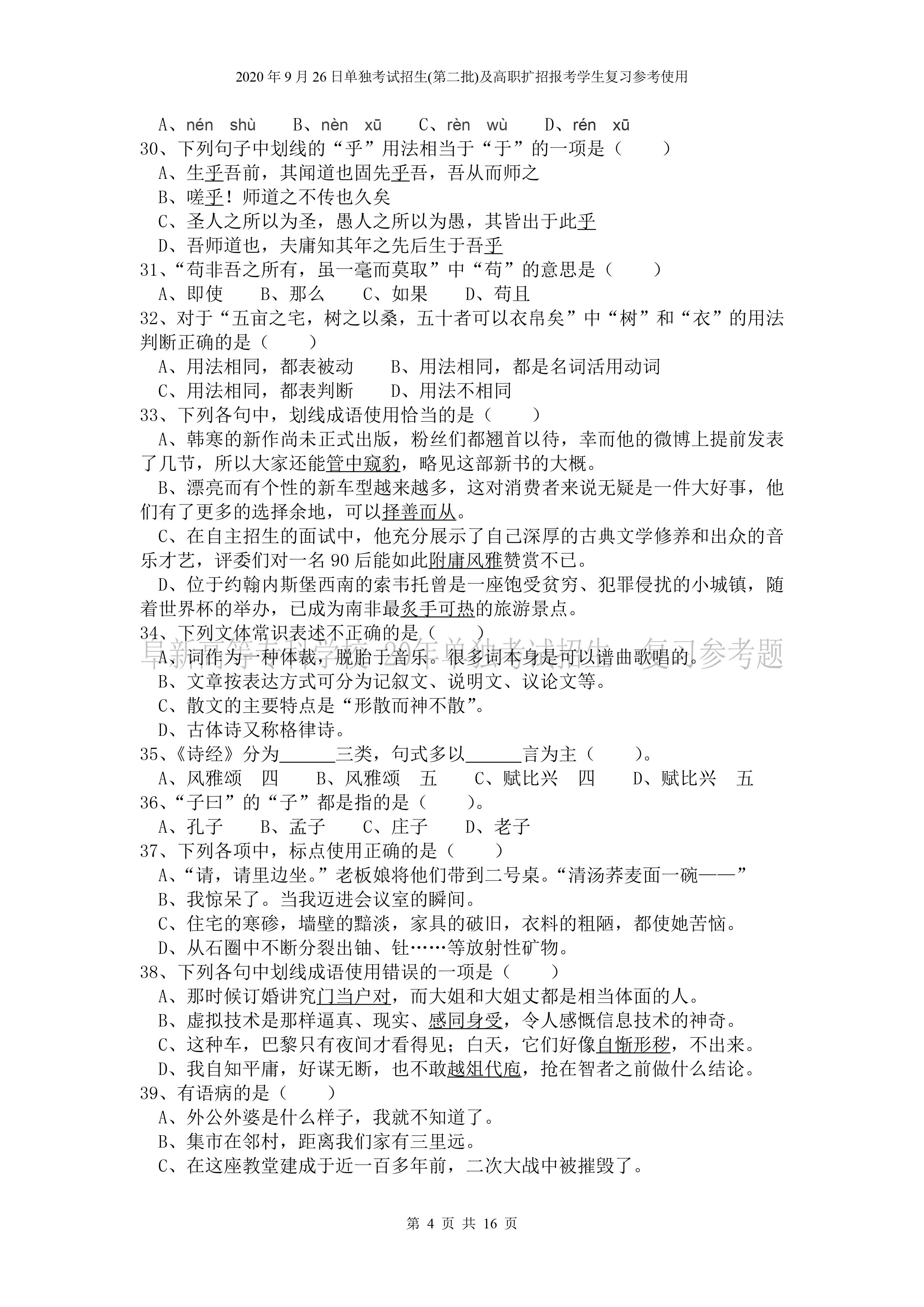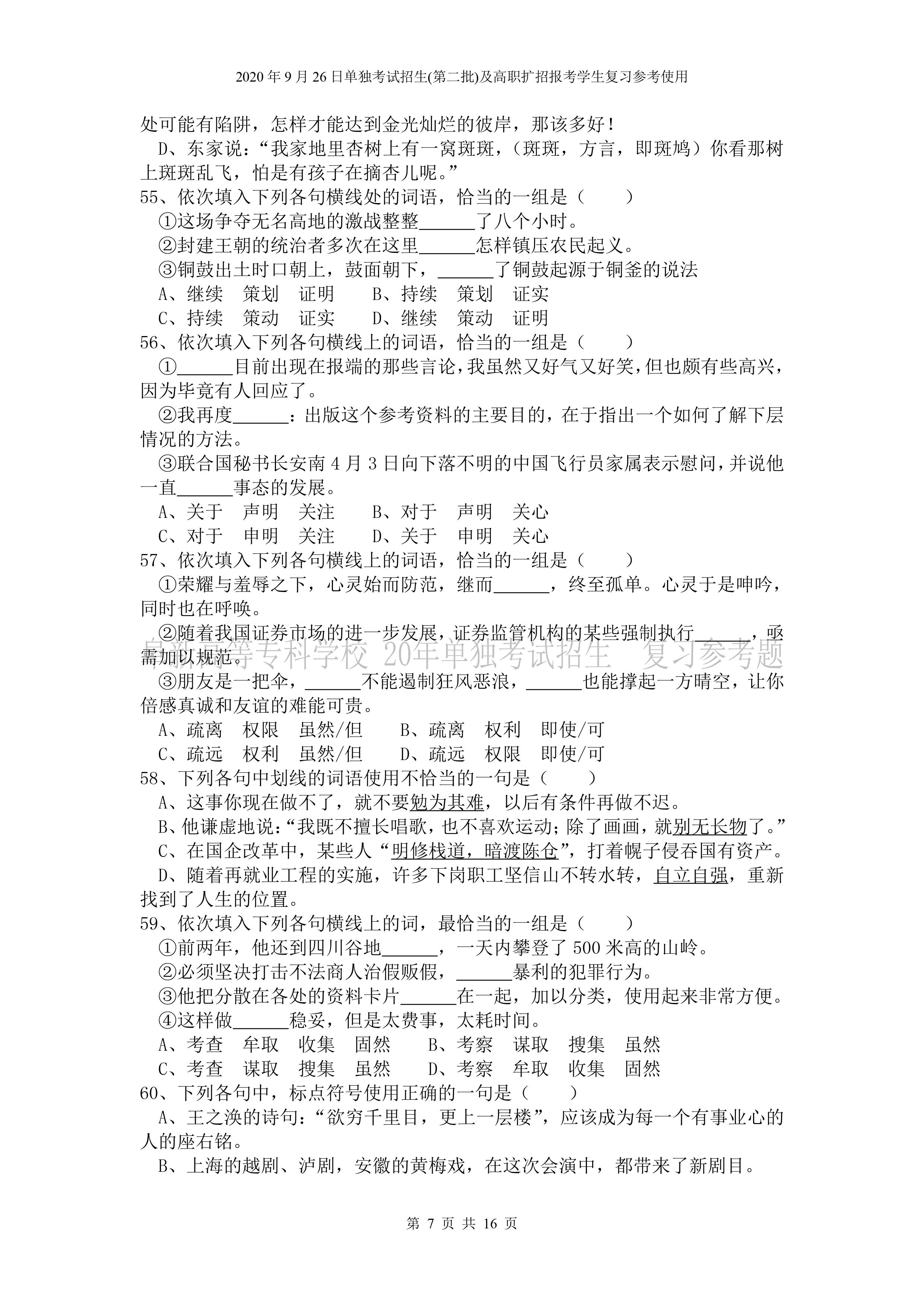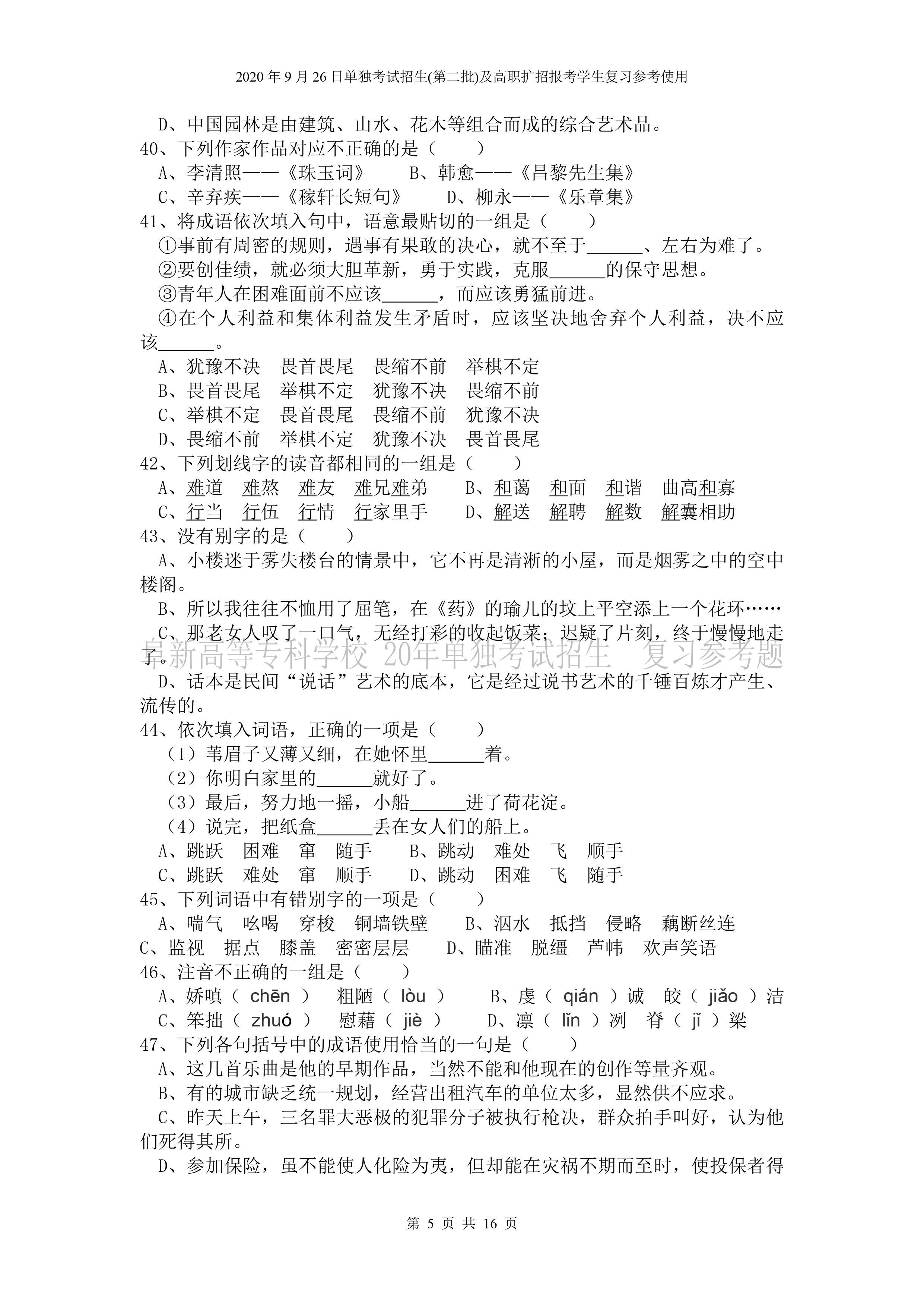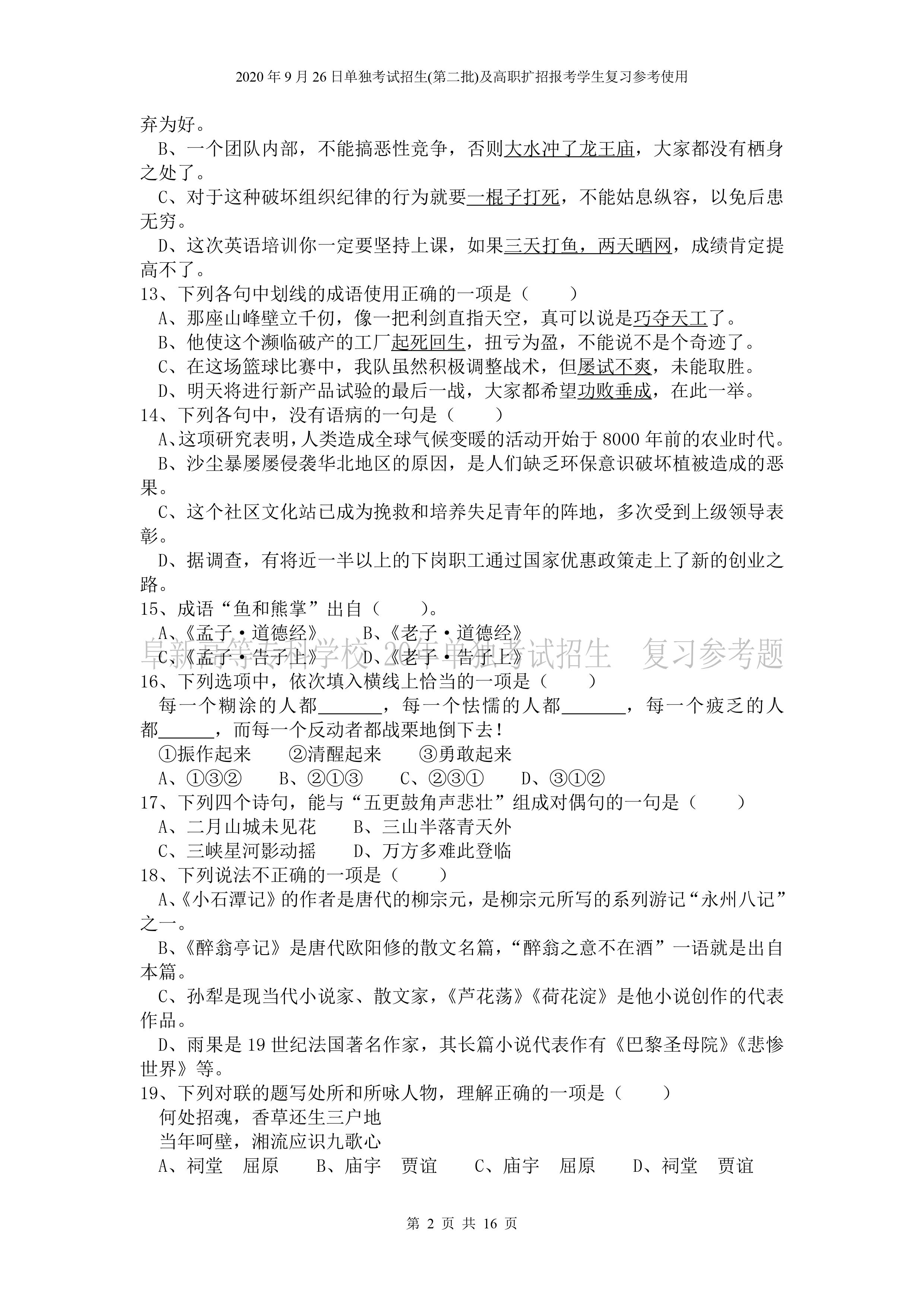beat365英国官网网站2026年单独招生考试 《语文》复习参考试题