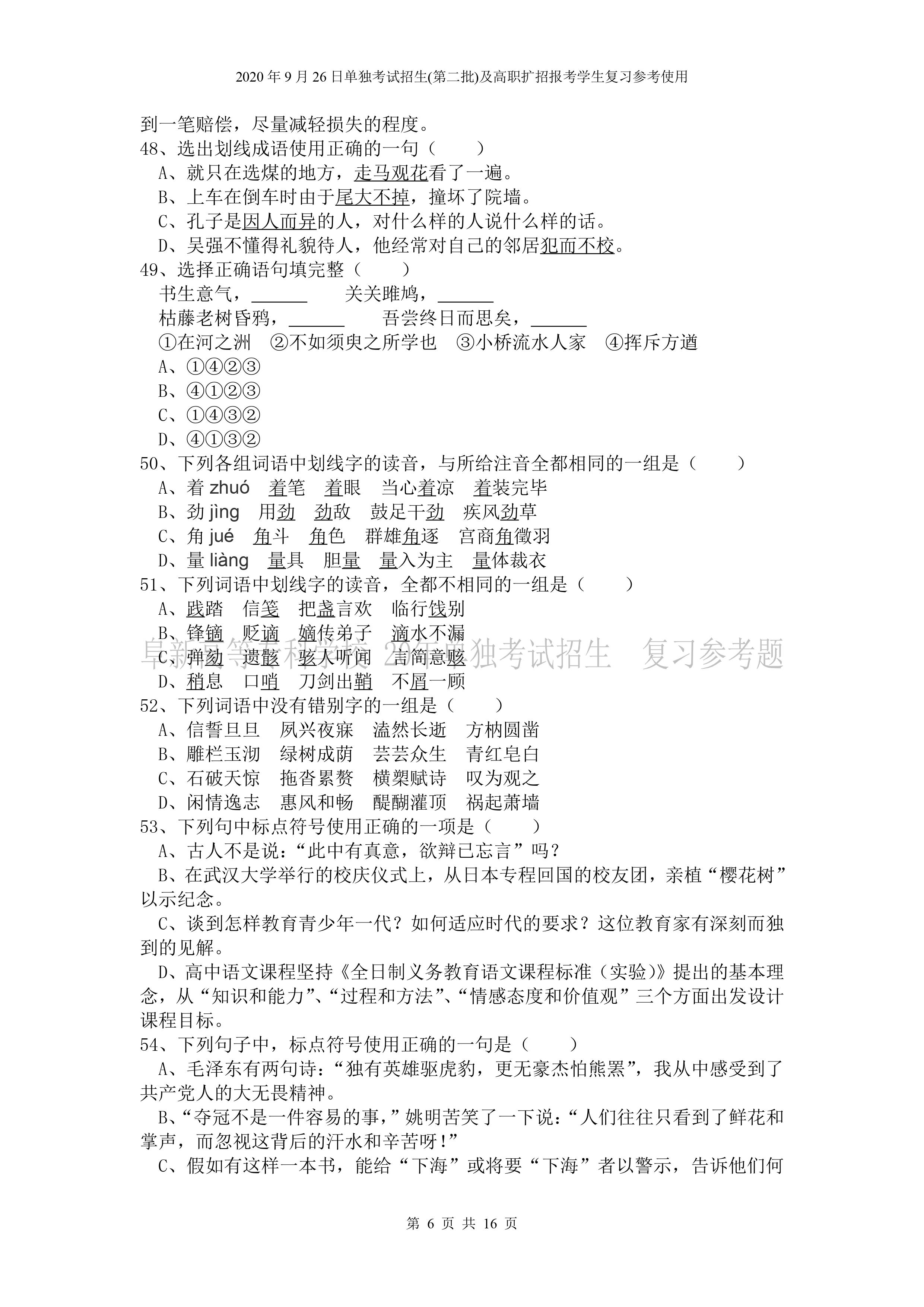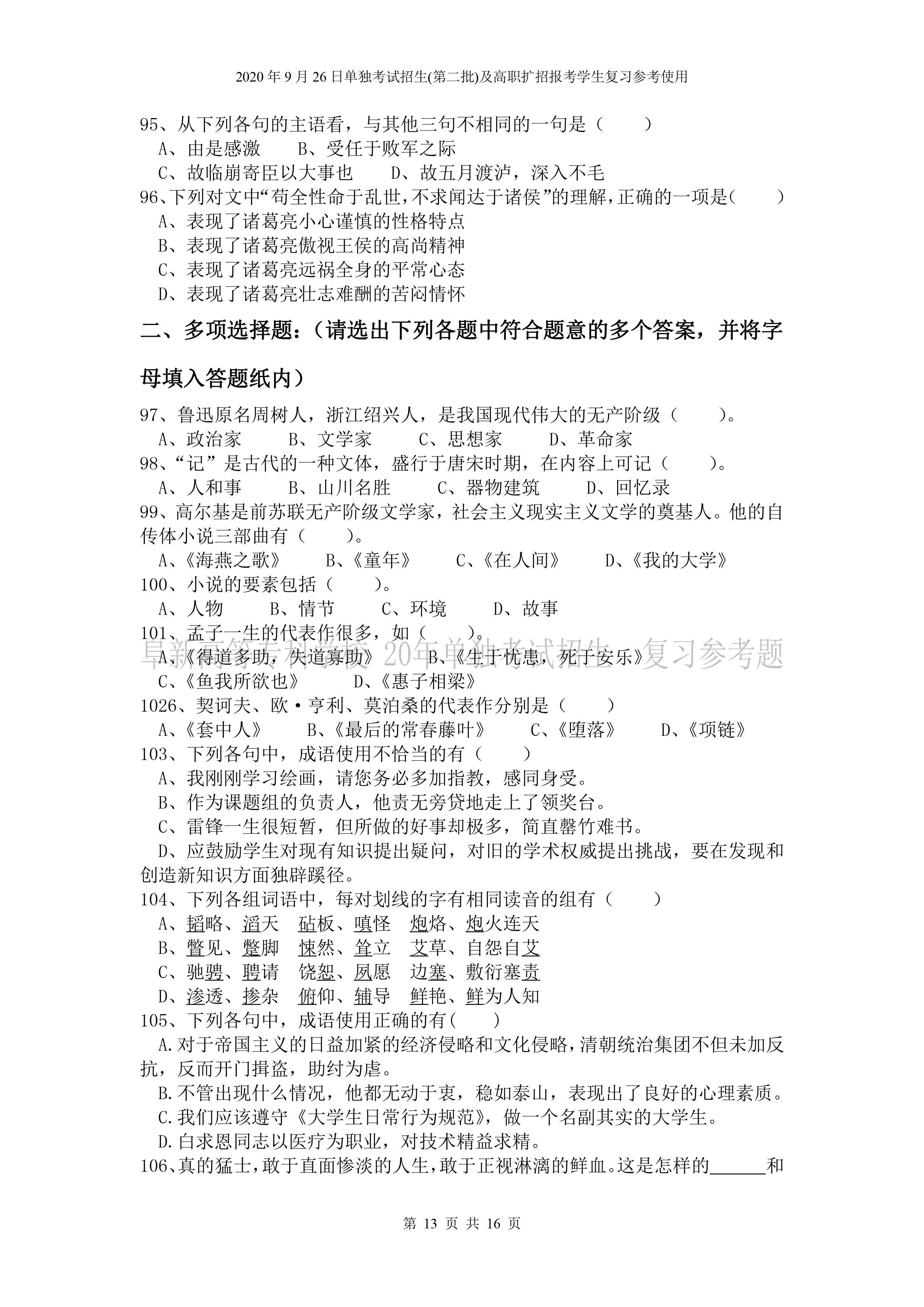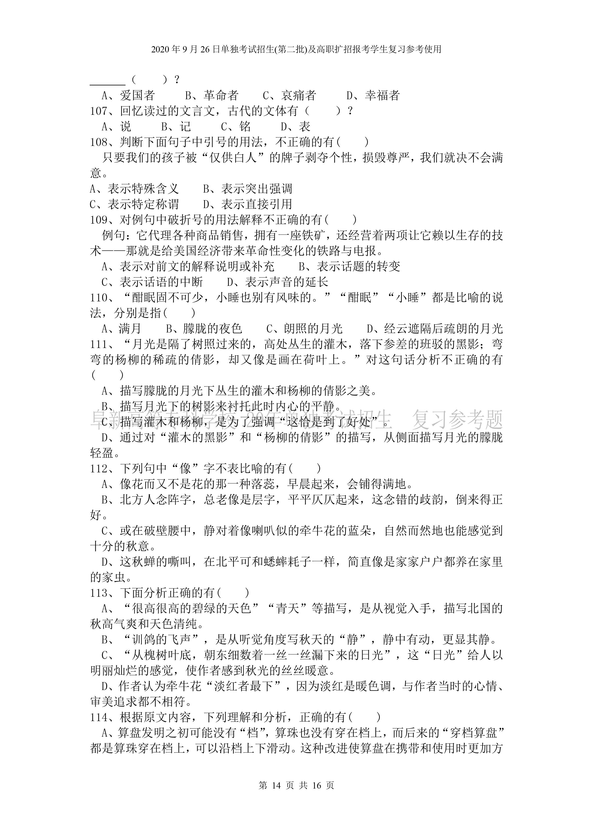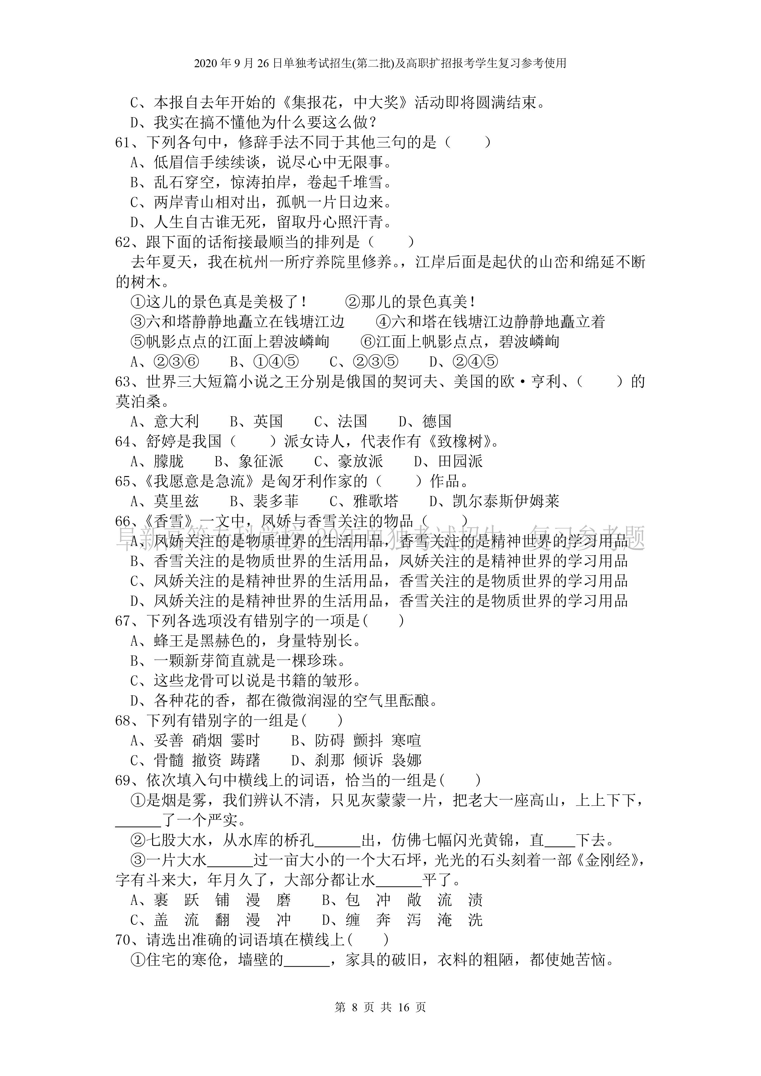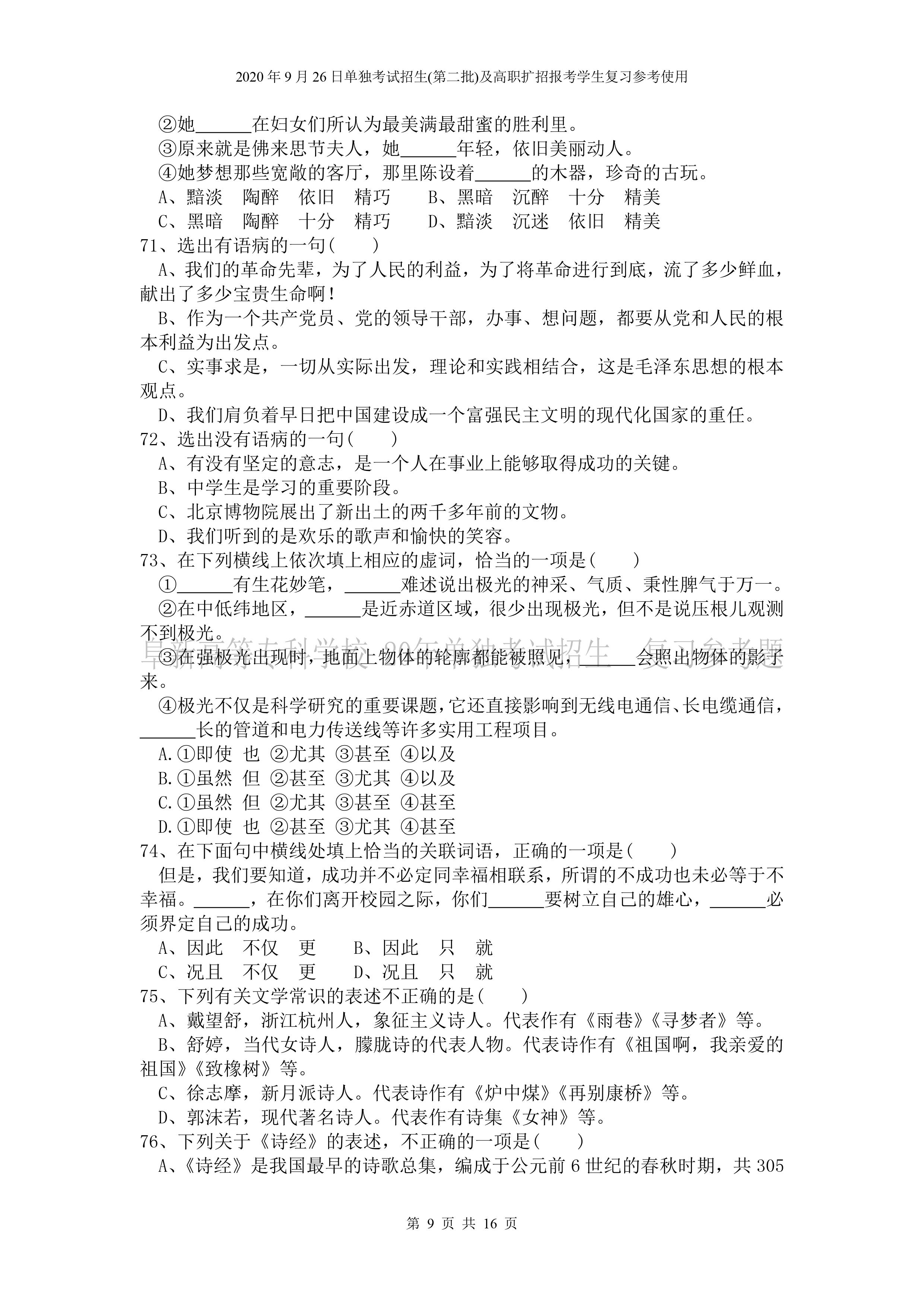 beat365英国官网网站2020年9月26日招生考试《文化素质》复习参考试题